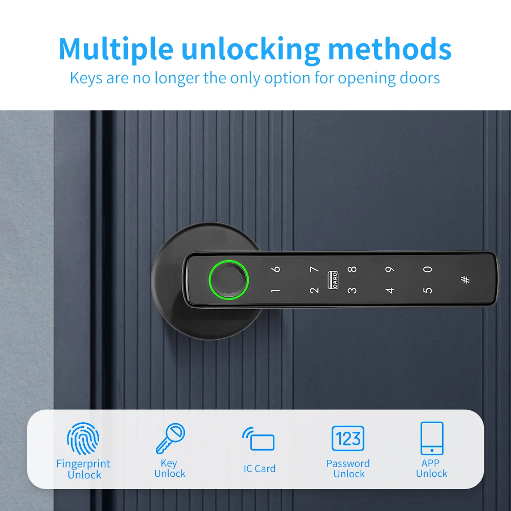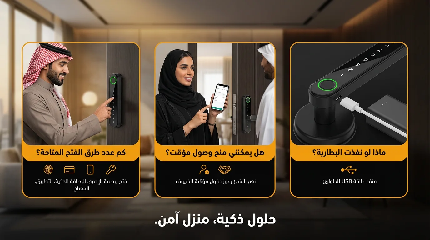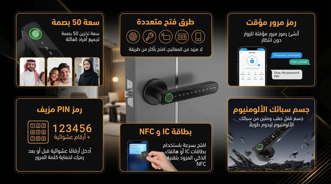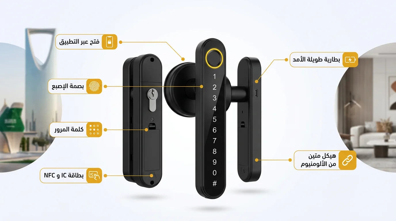 - طرق فتح متعددة: بصمة الإصبع، كلمة مرور، تطبيق الهاتف، Bluetooth وWiFi